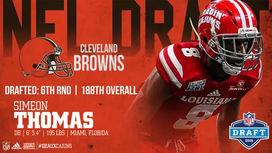 The Cleveland Browns, with the 188th pick in the sixth round of the 2018 NFL Draft took Thomas, making it two defensive backs from Louisiana drafted in this year's draft. It's the first time since 2011 that the Cajuns have had two players taken in the same draft, when Bill Bentley (Detroit Lions, third round, 85th overall) and Ladarius Green (San Diego Chargers, fourth round, 110th overall) went in the 2011 NFL Draft.